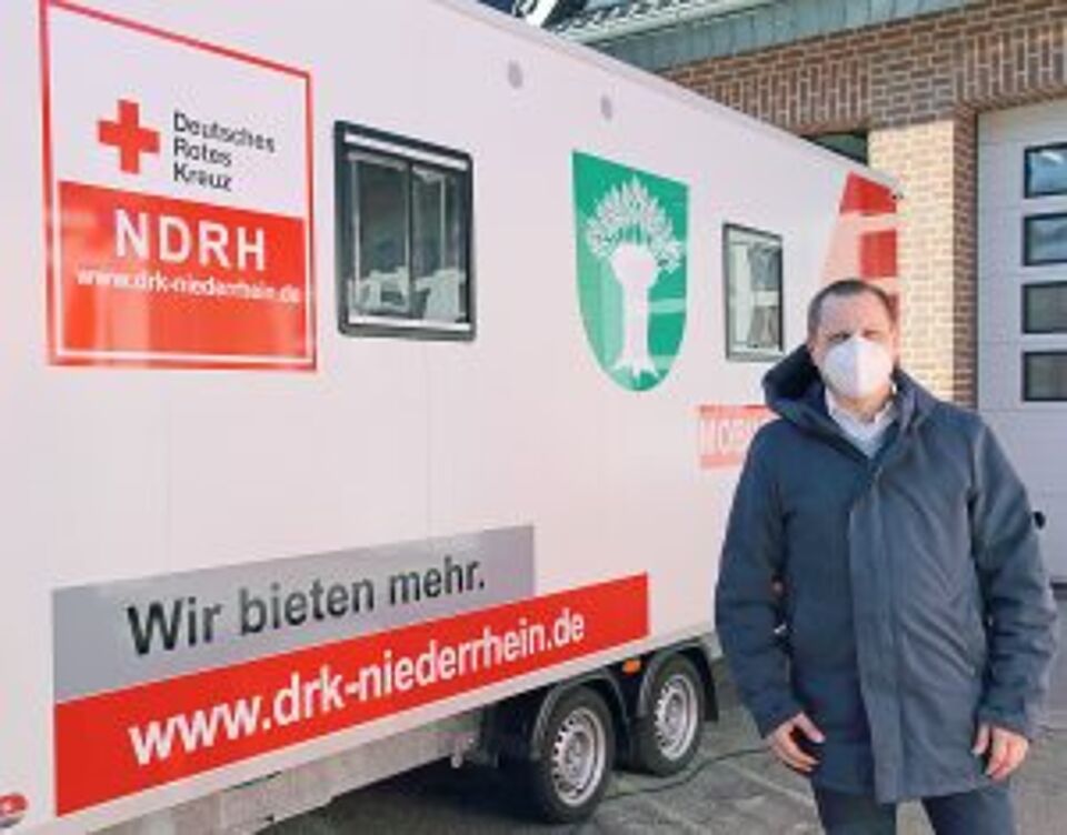 „Der erste Eindruck ist ganz gut“, zeigte sich Ludger Ferdenhert vom DRK-Kreisverband zufrieden. Getestet wurde die mobile Impfstation heute mit einem Anhänger mittlerer Größe, in dem eine Impfstelle zur Verfügung steht. Ferdenhert verwies aber darauf, dass auch größere Einheiten mit mehr Impfstellen aufgestellt werden könnten. Zusätzlich könne man das nötige Material und Personal auch mit Bussen anreisen lassen, wenn die Gegebenheiten vor Ort, etwa in Kindertageseinrichtungen, Schulen oder Einrichtungen der Wiedereingliederungshilfen, für eine Impfung geeignet wären. Bei dem Testlauf habe man zunächst sehen wollen, wie viel Zeit pro Person eingeplant werden muss und ob Abläufe optimiert werden können. „Wir sind in jedem Fall bereit“, stellte Ferdenhert fest.