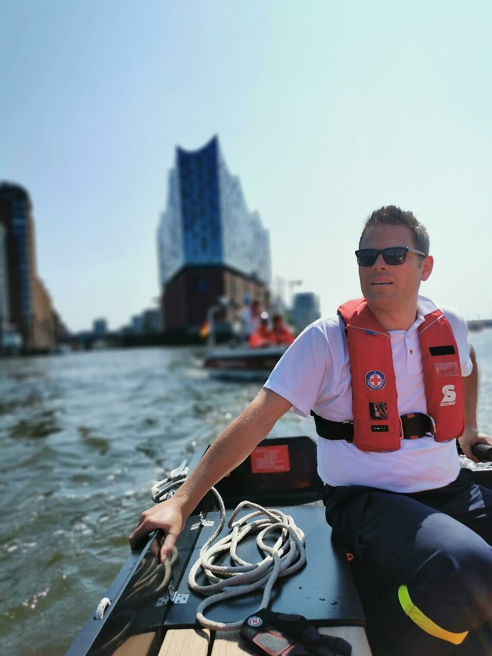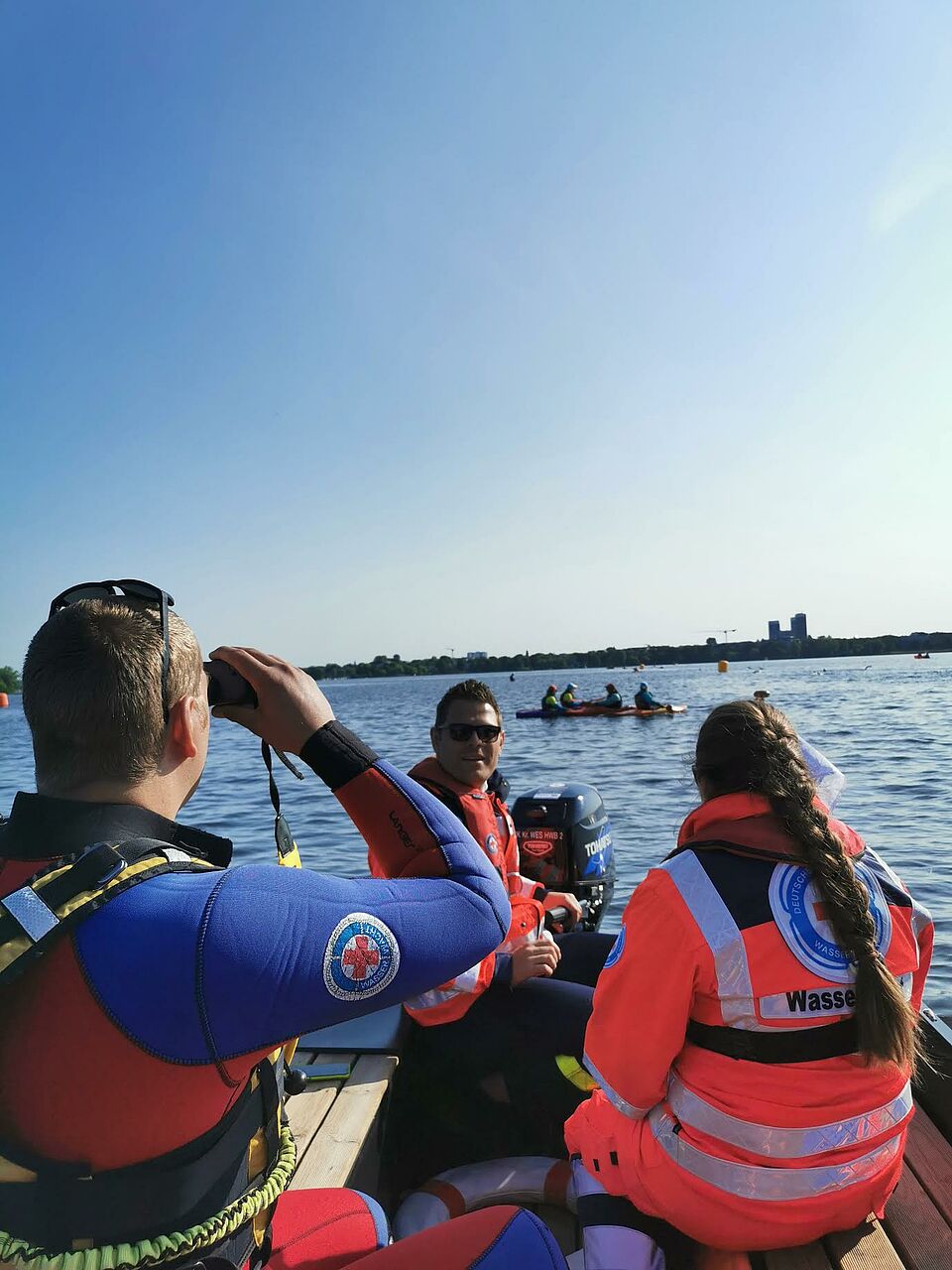 Bereits um 4 Uhr am nächsten Morgen standen die Aktiven wieder auf dem Boot bereit, um pünktlich den ersten Start um 6 Uhr gemeinsam mit anderen Einheiten der DRK Wasserwacht abzusichern. Mehrmals mussten die Retter bei den knapp 3.000 Teilnehmenden eingreifen, um auf der Schwimmstrecke schlimmeres zu verhindern.