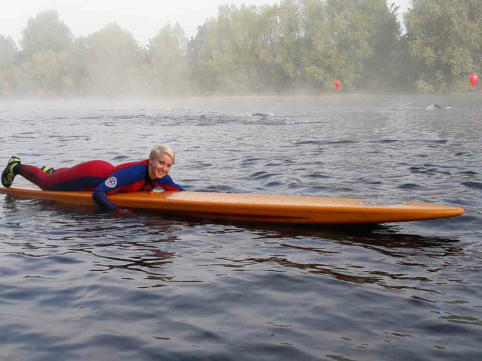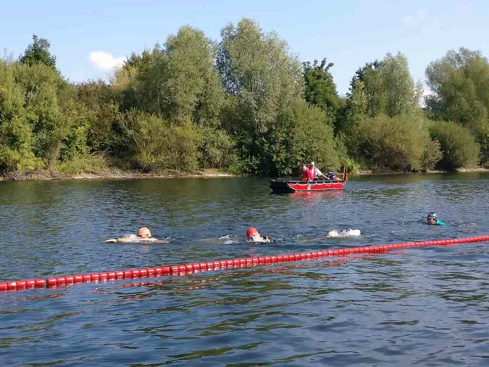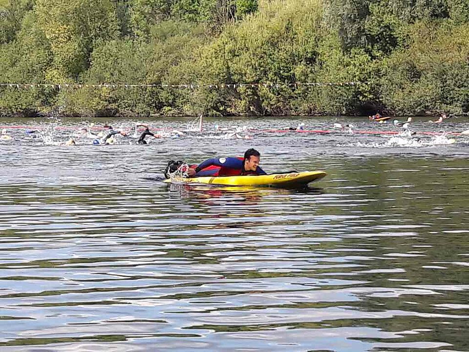 Mit zwei Rettungsbooten und mehreren Schwimmbrettern wurden die Triathleten auf der gesamten Schwimmstrecke von über 1,5 Kilometer von 11 aktiven Rettungsschwimmern der Wasserwacht begleitet. Eine Herausforderung in diesem Jahr war der dichte Nebel zu den ersten Starts. Dennoch haben alle Schwimmer den Weg dank der jahrelangen Erfahrung der vorausfahrenden Rettungsboote als Lotsen gefunden. Außergewöhnlich war die im Vergleich zu den Vorjahren hohe Zahl an Hilfeleistungen im Wasser. Einige Schwimmerinnen und Schwimmer mussten vorzeitig aufgeben, da sie wegen Tritten vor den Brustkorb im allgemeinen Startgetümmel Luftnot bekamen. Vielfach wurden auch die eigenen Schwimmleistungen überschätzt. Während die Disziplinen Laufen und Radfahren gut geübt werden können, ist es nicht so einfach, die Strecke in einem Schwimmbad zu simulieren. Damit die sportliche Großveranstaltung auch an Land gesichert verläuft, ist die Bereitschaft des DRK Rheinberg schon traditionell in den Dienst eingebunden. Mit mehreren Rettungswagen, einem Notarzt sowie Ersthelfern zu Fuß und mit dem Fahrrad wurden die über 1.200 Sportler umfassend begleitet. Im Triathlonkalender ist mit dem Xantener Event das Jahr beendet. Für die Wasserwacht geht es jedoch immer weiter. Der nächste Termin führt die Helferinnen und Helfer ins Ausland. In Venlo findet eine große Ausstellung mit deutschen und niederländischen Rettungseinheiten statt. Bei der "112 on Wheels" vertritt die Wasserwacht und die Bereitschaft Rheinberg gemeinsam mit dem DRK-Alpen den Niederrhein.