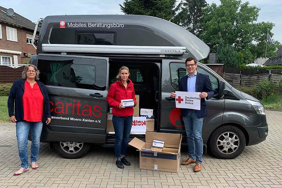 Beide Verbände, DRK und Caritas, übergeben die gespendeten Artikel nun gemeinsam an die, die sie benötigen. Rund 800 Hilfsbedürftige erhalten jetzt am "Mobilen Betreuungsbüro" kostenfrei Desinfektionsmittel, Mund- und Nasenschutzmasken, Behelfs- und auch FFP2-Masken sowie Handschuhe.