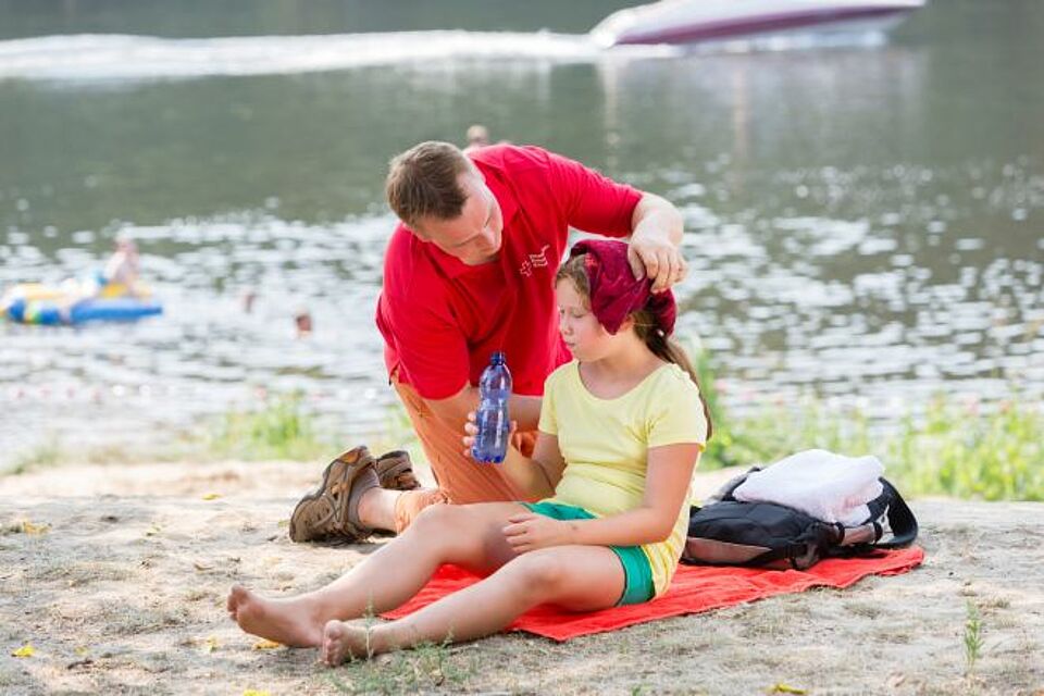 Erste Hinweise für einen Hitzenotfall können Kopfschmerzen, Schwindel, aber auch ernste Kreislaufprobleme, ein plötzlicher Kreislaufkollaps sein. Hier helfen gekühlte, elektrolythaltige Getränke, wie Apfelsaftschorle. Durch das Ablegen überflüssiger oder das Öffnen beengender Kleidung kann ein Wärmestau verhindert werden. Sorgen Sie bei Hitzschlag oder Hitzeerschöpfung für Kühlung durch kalte Umschläge und das Zufächeln von Luft. Wenn sich der Zustand der oder des Betroffenen durch die Erste-Hilfe-Maßnahmen nicht bessert, rufen Sie den Rettungsdienst (Tel. 112).“