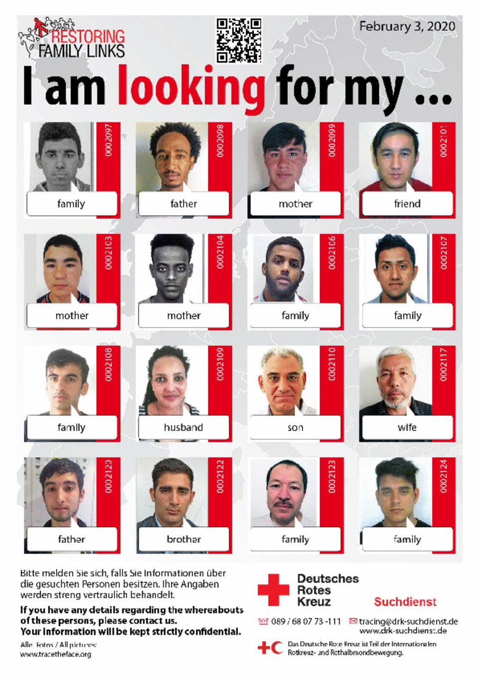 Trace the Face des IKRK und nunmehr 23 europäischer Rotkreuz-Suchdienste ermöglicht Betroffenen, sich direkt an die Rotkreuzgesellschaft ihres Aufenthaltslandes zu wenden und über diese ein Foto von sich selbst als suchende Person veröffentlichen zu lassen.