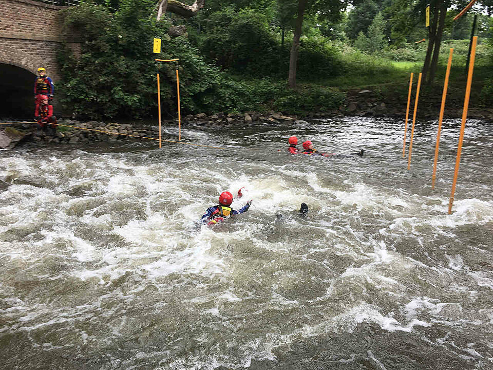 Dazu fand an der Erft in Neuss eine Tagesveranstaltung mit vollem Programm statt. An verschiedenen Stationen wurden von morgens bis abends diverse Rettungstechniken und der Einsatz komplexer Seilsysteme (Seilfähren, Flaschenzüge) geübt.