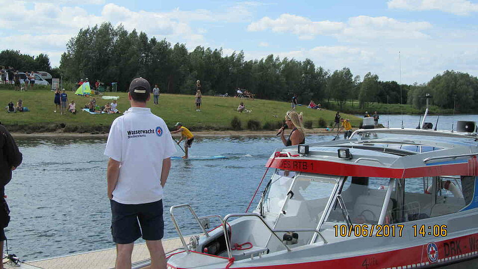 Die DRK-Wasserwacht betreute diesen Einsatz mit acht Einsatzkräften, zwei Rettungsbooten und einem Krankentransportwagen mit spezieller medizinischer Notfallausstattung.