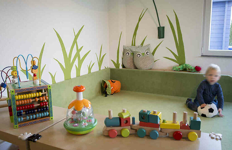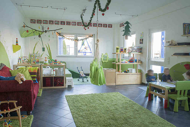 Der große Spielbereich ist ausgestattet mit einem Mal- und Basteltisch, einem XXL-Spielpodest mit Rampe, einer Hängeschaukel, einer Spielküche, einem Sofa, einem Autoteppich und vielen ausgewählten sinnesanregenden Spielmaterialien. Daran anschließend befindet sich der Essbereich mit einer modernen Küchenzeile und einem geräumigen Esstisch mit kindgerechter Bestuhlung.