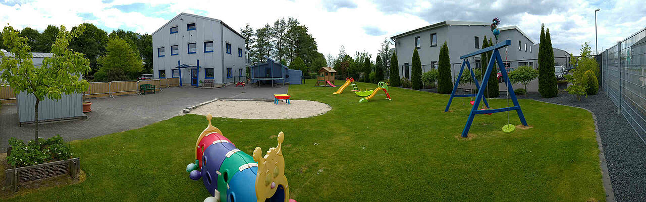 Ein Highlight ist der großzügige Auenspielbereich. Auf einem großen separaten Bereich, bestehend aus einer Spielwiese und einer gepflasterten Fläche gibt es vielfältige Spielgeräte wie Schaukel, Rutsche und Sandkasten.