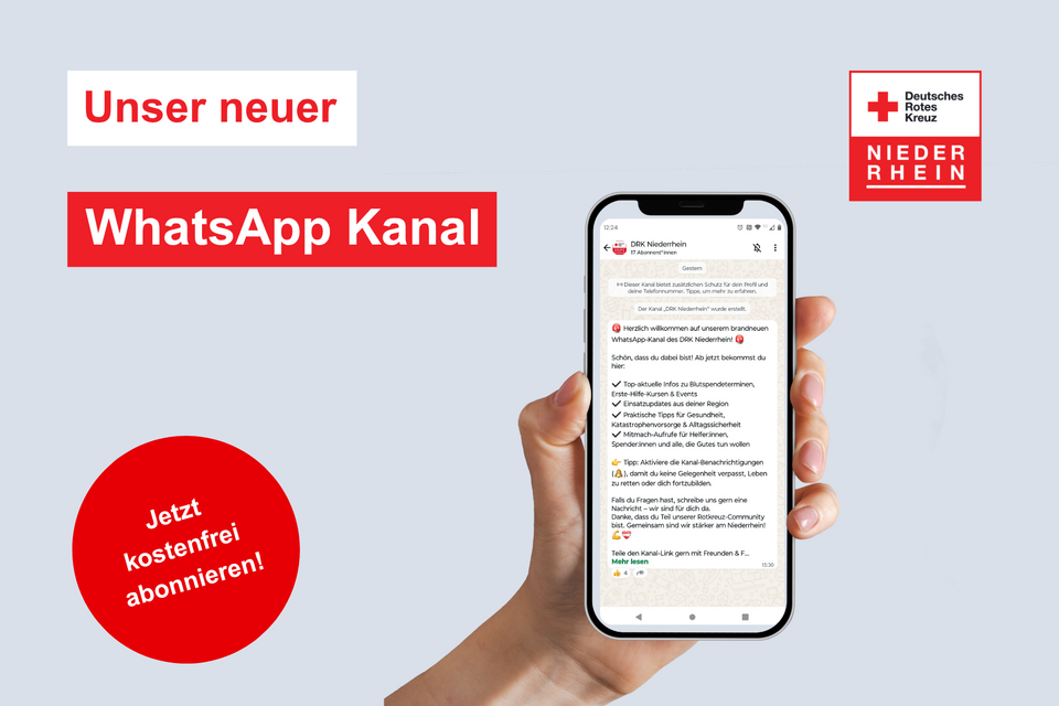 Der DRK Kreisverband Niederrhein bringt seine vielfältigen Angebote jetzt noch näher zu den Menschen: Mit einem neuen WhatsApp-Kanal landen Neuigkeiten künftig direkt in der Hosentasche. Ob Informationen rund um ambulante Pflege, Essen-auf-Rädern, Hausnotruf oder Familienbildung – wer den Kanal abonniert, erhält praktische Tipps, Terminerinnerungen und Geschichten aus dem Rotkreuz-Alltag bequem auf dem Smartphone und bleibt so immer über das soziale Engagement in der Region informiert. „Mit dem Kanal holen wir die Menschen dort ab, wo sie täglich unterwegs sind“, erklärt Jan Höpfner Präsident des Kreisverbands. „Ob Blutspendetermine, Erste-Hilfe-Kurse oder aktuelle Einsatz-Updates – alle relevanten Rotkreuz-News landen nun direkt auf dem Sperrbildschirm.“
