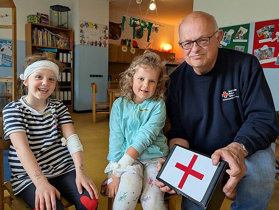 Die Idee stammt von Gottfried Mainka, 71 Jahre alt, pensionierter Sonderpädagoge und langjähriger Ausbilder für Erste Hilfe für das DRK im Kreis Wesel. „Kinder sind oft die besseren Ersthelfer“, sagt er mit einem Lächeln. „Sie haben ein großes Herz, wenig Hemmungen – und sie trauen sich einfach, etwas zu tun.“ Die Inspiration kam bei einem Moment voller Nähe und Musik: Gemeinsam mit seiner 5-jährigen Enkelin Nele hörte Mainka das fröhliche und zugleich lehrreiche Kinderlied „Pusten, trösten, Pflaster drauf!“ von Kai Hohage. Die eingängigen Strophen, in denen Karlchen vom Roller fällt, Frida gegen die Schaukel läuft und Papa sich den Zeh stößt, brachten beide zum Lachen – und gaben den Anstoß für ein Herzensprojekt.