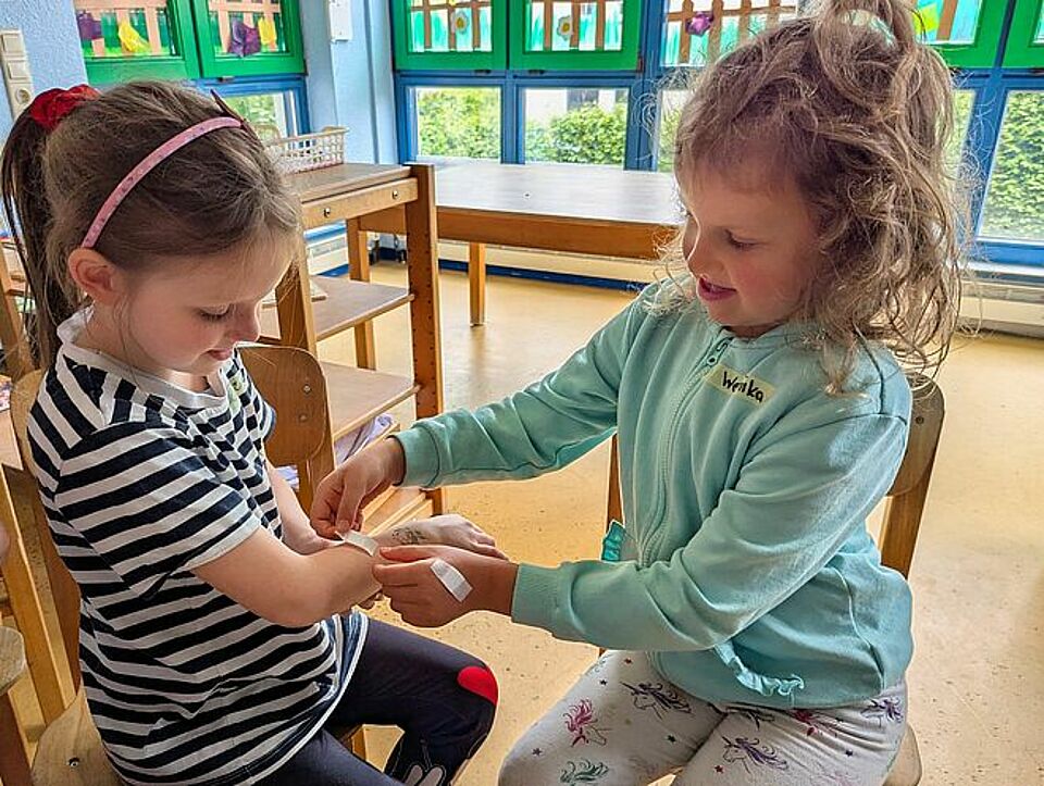 Im Rahmen der Generalprobe in der Kita Gänseblümchen wurde nicht nur gesungen, sondern auch praktisch geübt: Wie lege ich ein Pflaster an? Wie kühle ich eine Beule? Was sage ich, wenn jemand weint? Es wurde gewickelt, geklebt, getröstet – mit viel Begeisterung und noch mehr Lachen. Leonie war besonders flink beim Pflasterkleben – sie verzierte jedes Pflaster mit einem kleinen Smiley, „damit der Schmerz schneller vergeht“. Weronika erklärte ganz selbstverständlich: „Wenn jemand hinfällt, dann nehme ich ihn an die Hand und sag: Es wird alles wieder gut.“ Ein Junge, der sich erst ein bisschen genierte, taute beim Singen schnell auf. „Das mit dem Löffel zum Kühlen war cool!“, sagte er später stolz. Tatsächlich erfuhren die Kinder, dass ein kalter Löffel einfach aus der Schublade geholt eine schnelle Hilfe bei kleinen Beulen sein kann – ein Tipp, der schon bei den Kleinsten Eindruck hinterließ. Lilly wiederum probierte sich gleich mehrfach am Verbände anlegen: „Ich bin jetzt Verbandsprofi!“, rief sie, während sie Vincent versorgte, der sich beim imaginären Treppensturz den Arm „verletzt“ hatte.
